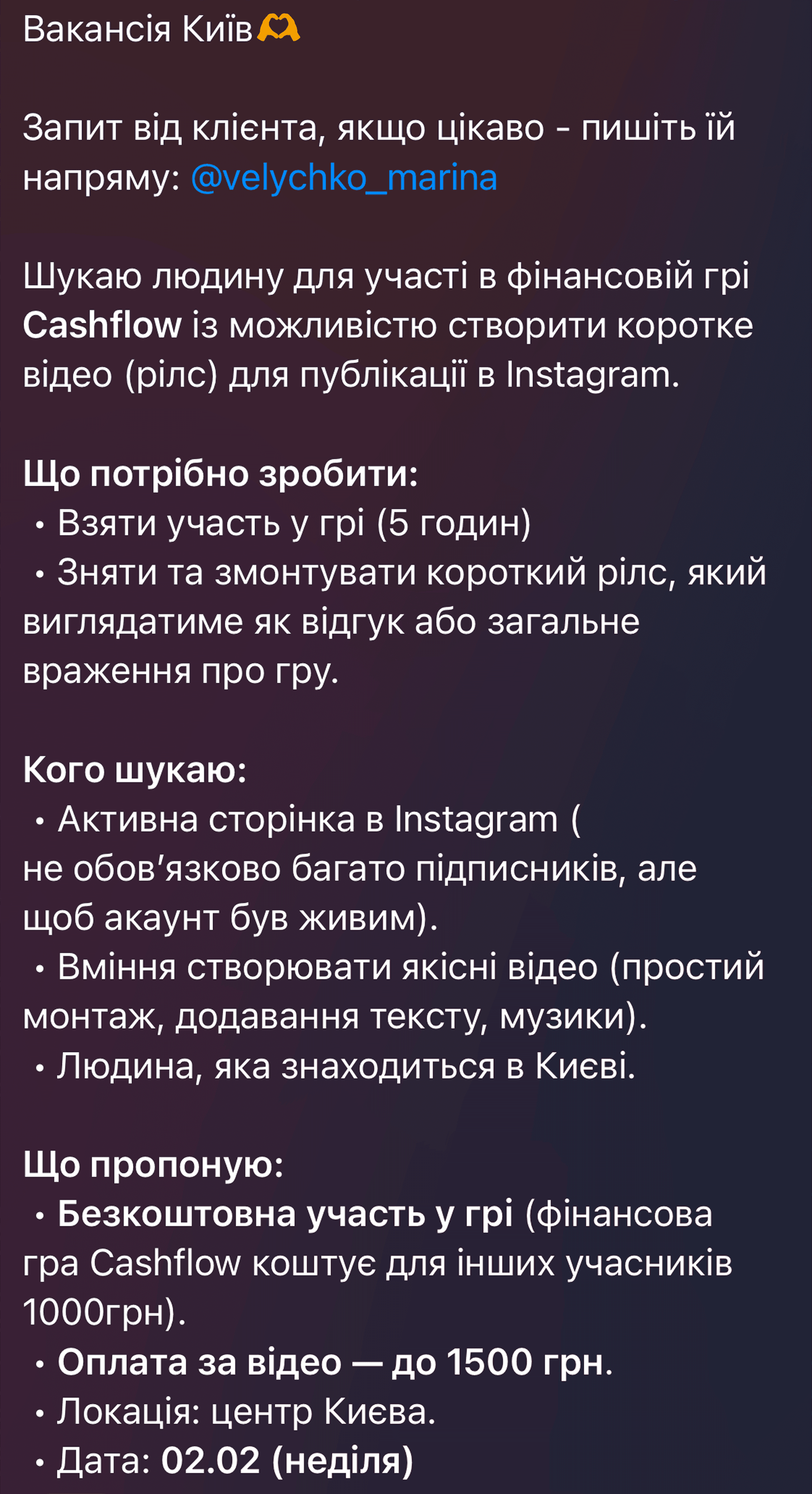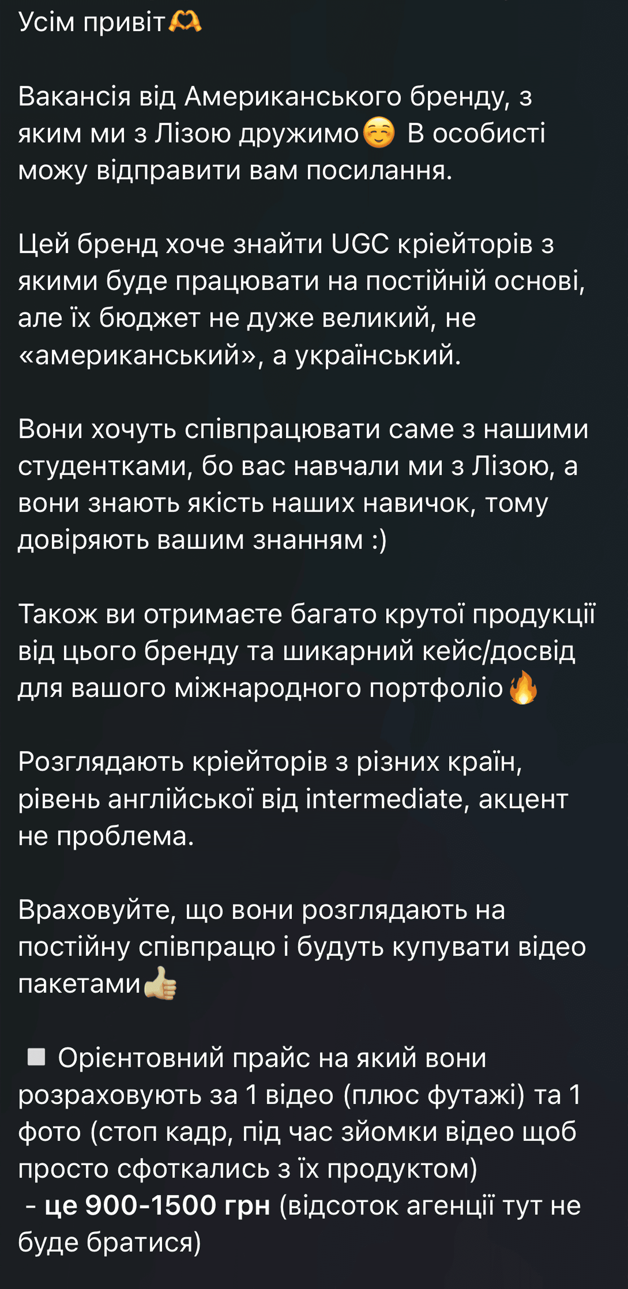 Content Creators Club - це не тільки навчання, а також й агентство, яке вже понад 2,5 роки дає роботу своїм учням. Наші студенти швидко відбивають вартість навчання, подаючись на оплачувані вакансії від агенції, створюючи контент для українських, американських та інших міжнародних замовників.